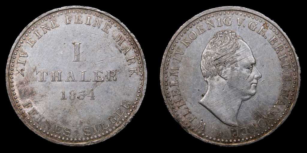 A continuación veremos un Thaler de Hannover emitido en su estandar propio, de alta pureza (992 de fino) previo a la adhesión al Zollverein (unión económica que se creó en 1834 entre diversos estados alemanes):