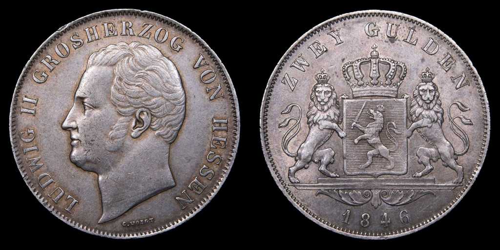 Lote 384. Alemania. Gran Ducado de Hesse-Darmstadt. Ludwig II (1830-1848) 2 Gulden 1846. Darmstadt mint. Plata 900; 36.0mm; 21.15g. Emisión de 270.000 KM321 (XF) Marquitas en anverso