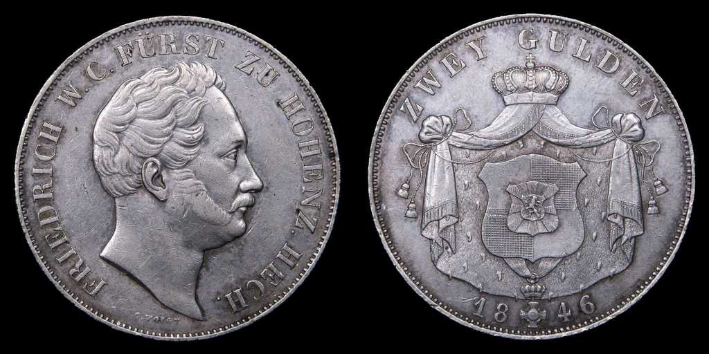 Lote 385. Alemania. Principado de Hohenzollern-Hechingen. Friedrich Wilhelm Constantin (1838-1849) 2 Gulden 1846. Plata 900; 35.5mm; 21.16g. Escasa. Emisión de 4.300 ejemplares. KM48 (XF) Marquitas