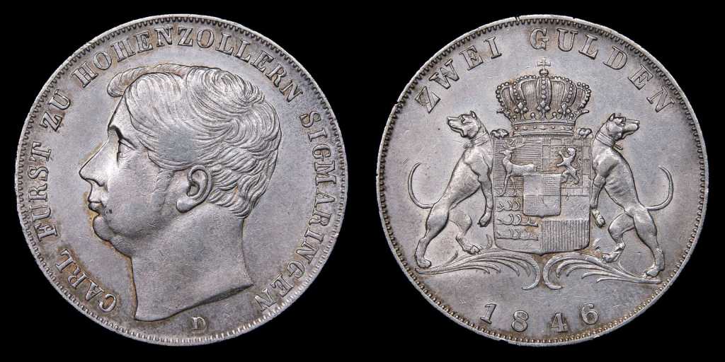 Lote 386. Alemania. Principado de Hohenzollern-Singmaringen. Karl (1831-1848) 2 Gulden 1846 D. Baden-Württemberg mint. Plata 900; 36.0mm; 21.20g. Escasa. Emisión de 9.206 ejemplares. KM24 (XF)