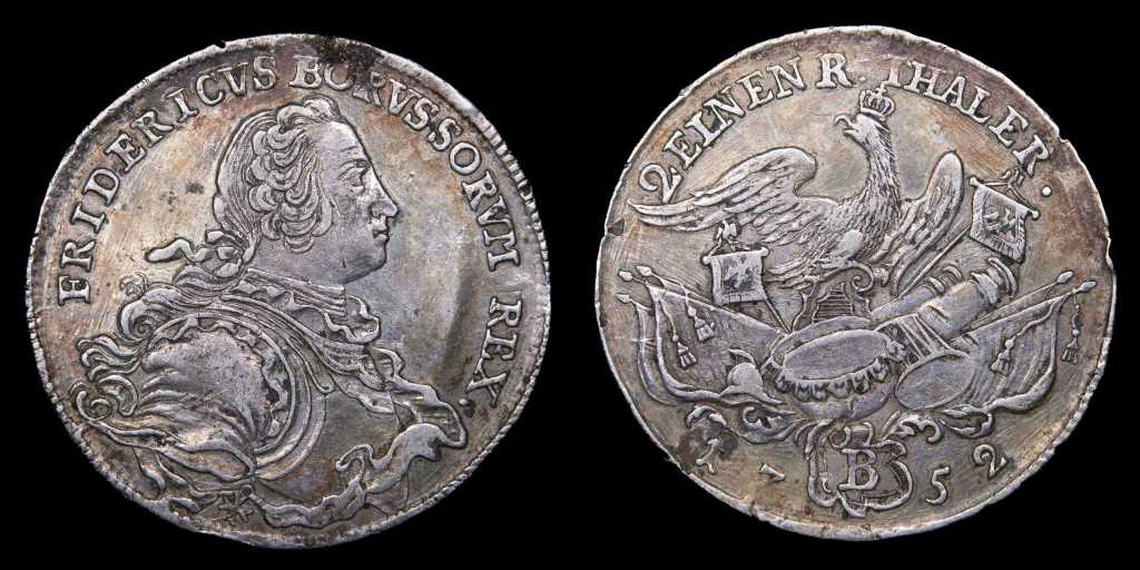 Comenzamos con piezas con denominación tipo Thaler. A partir de 1750, con la reforma de Graumann, el Thaler prusiano se estandarizo en 750 de fino y un peso aproximado de 22,27g., reemplazando además las iniciales de los maestros de ceca por las marcas de ceca. A continuación traemos un 1/2 Thaler perteneciente a esta reforma: