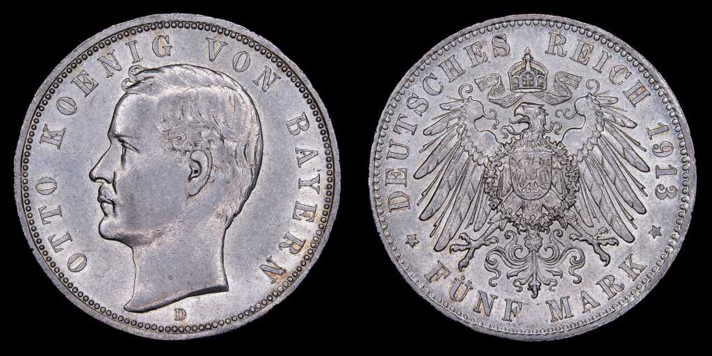 Lote 391. Estados Alemanes. Reino de Bavaria. Otto (1886-1913) 5 Marks 1913 D. Plata 900; 38.0mm; 27.77g. KM915. (AU)