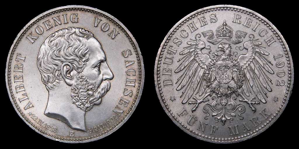 Lote 392. Alemania. Reino de Sajonia. Albrecht I (1873-1902) 5 Mark 1902 E. Muldenhütten mint. Conmemorativa del fallecimiento Albrecht I. Plata 900; 38.0mm; 27.75g. Emisión de 100.000 ejemplares. KM1256 (UNC)