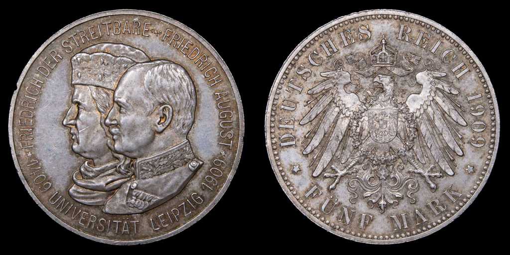 Lote 393. Alemania. Reino de Sajonia. Friedrich August III (1904-1918) 5 Mark 1909. Berlin mint. 500º Aniversario de la Universidad de Leipzig. Plata 900; 38.0mm; 27.79g. Escasa. Emisión de 50.000 ejemplares. KM1269 (AU) Rayón en rostro