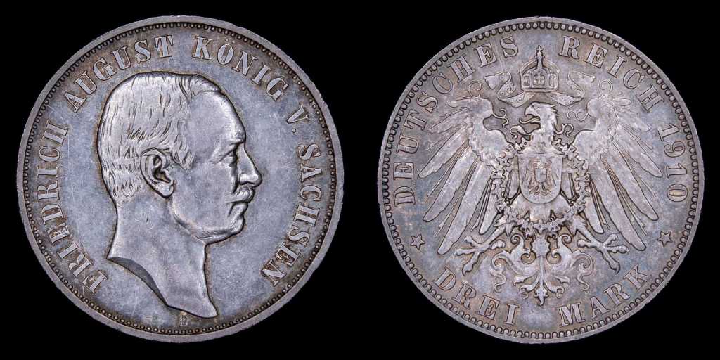 Lote 394. Estados Alemanes. Reino de Sajonia Albertina. Frederick Augustus III (1904-1918) 3 Marks 1910 E. Plata 900; 33.0mm; 16.67g. KM1267. (XF+) Rayita