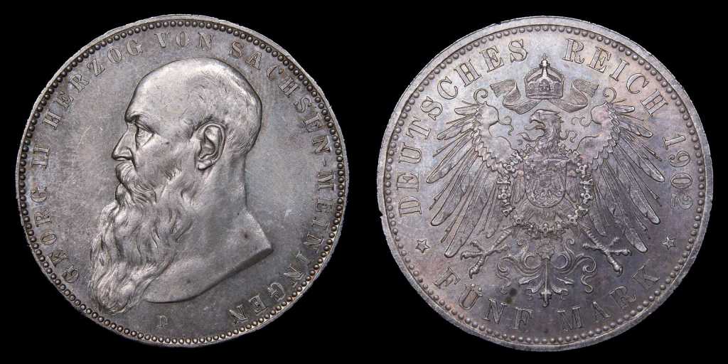 Lote 395. Alemania. Ducado de Sajonia-Meiningen. Georg II (1866-1914) 5 Mark 1902 D. Munich mint. Plata 900; 38.0mm; 27.82g. Escasa. Emisión de 20.000 ejemplares. KM200 (UNC) Bellísimo tono