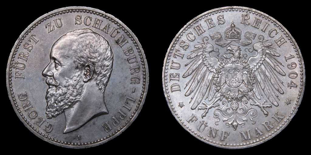 Lote 396. Alemania. Schaumburg-Lippe. Albert Georg (1874-1911) 5 Mark 1904 A. Berlin mint. Plata 900; 38.0mm; 27.75g. Escasa. Emisión de 3.000 ejemplares. KM50 (AU)