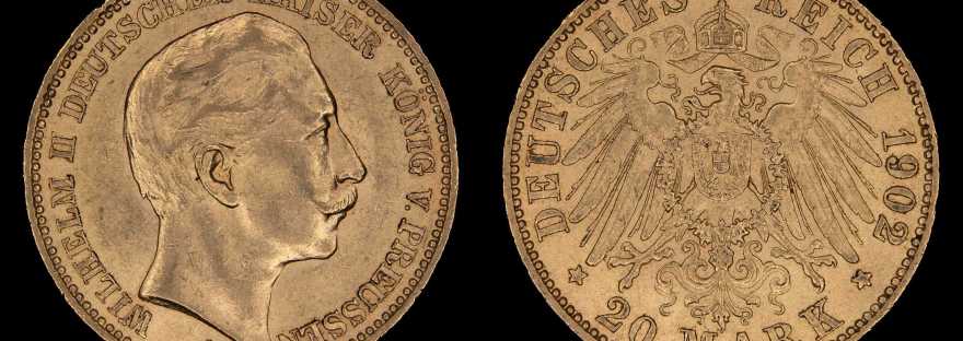 Finalmente tendremos algunas piezas ya unificadas bajo la denominación imperial del Deutsches Reich, el Marco. A continuación veremos algunos ejemplares, en oro y en plata, a nombre de los estados emisores del Imperio (Prusia, Bavaria, etc.) con los retratos de sus gobernantes locales, y ademas una linda pieza conmemorativa: