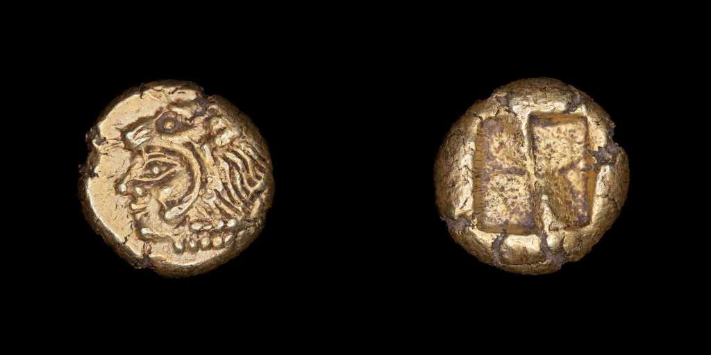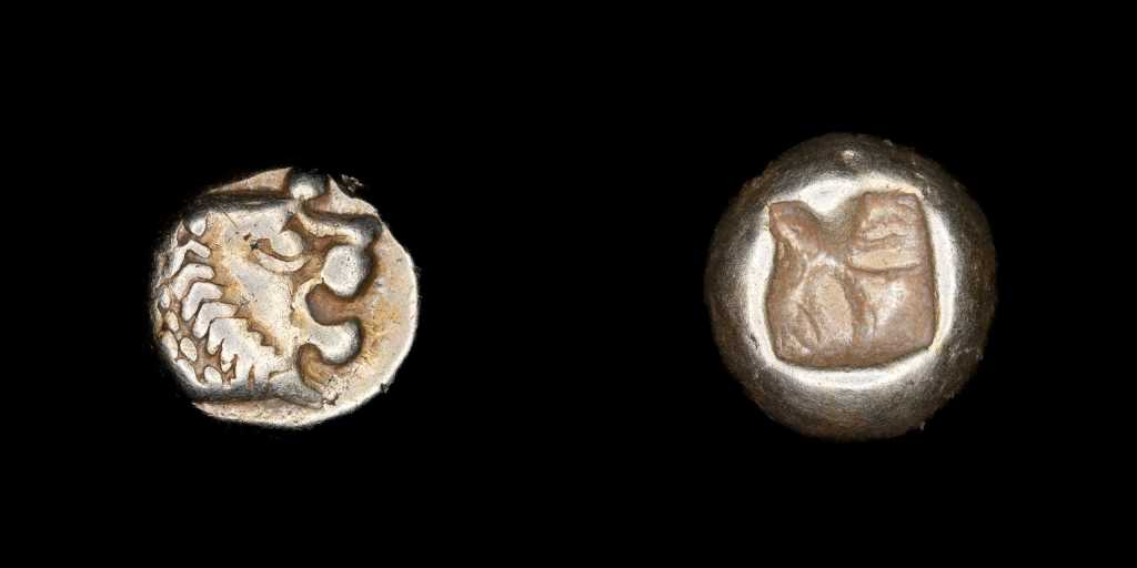 Del mundo griego comenzaremos por ver una de las monedas más antiguas que pueden conseguirse, un Hemihekté del período arcaico acuñado en electro (aleación de oro y plata) en Sardes, la capital del Reino de Lidia aproximadametne en la época de los reyes Aliates hasta Creso.