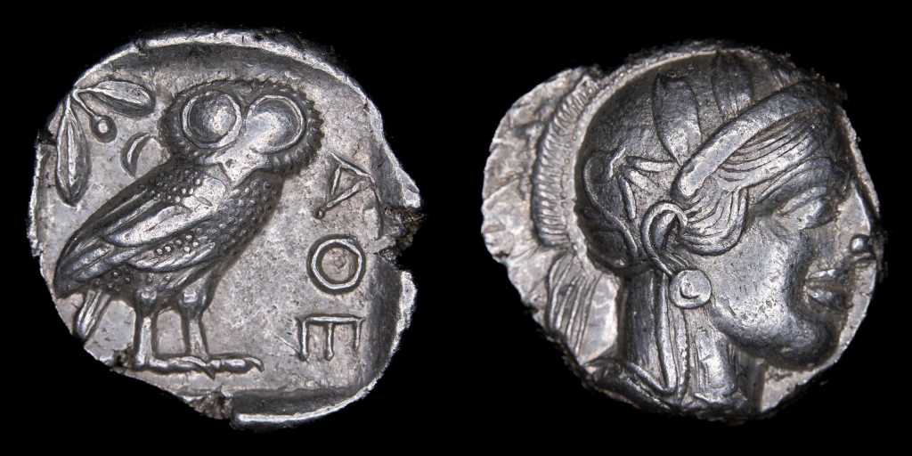 Luego seguiremos con la pieza antigua mas icónica de todos los tiempos: la «Lechuza» ateniense. Le traemos un bonito ejemplar, sin los usuales cortes de testeo, de una de las piezas que se acuñaron masivametne con la plata del monte Laurión en el período clásico, en tiempos de la hegemonia ateniense con Pericles a la cabeza de la ciudad, hasta la epoca de la Guerra del Peloponeso.
