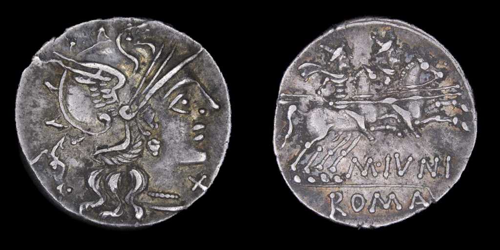 Comenzando por el período republicano, traemos tres Denarios de plata acuñados en la ceca de Roma. El primero acuñado por el Marco Junio Silano, magistrado monetario en 145 a.C., cuando dicha denominación aún equivalía a diez ases de bronce. En reverso puede verse a los Dióscuros, los hermanos gemelos adorados por los romanos por haberlos ayudado en la batalla del Lago Régilo en 496 a.C.