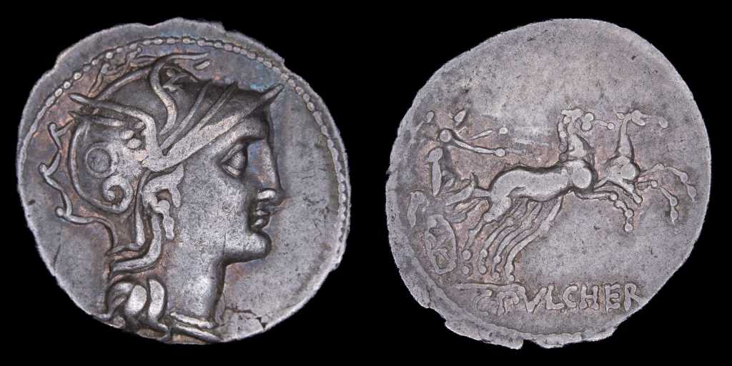 Continuamos luego con un Denario acuñado por Cayo Pulcher, magistrado en 110/109 a.C. con el tipo de reverso de Victoria en biga. Estas piezas ya se encontraban tarifadas en dieciséis ases.