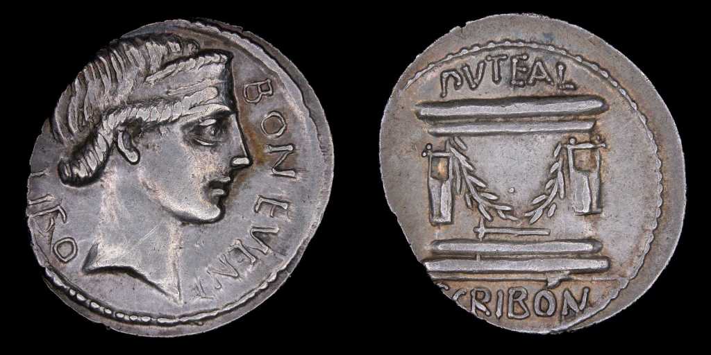 Por último tenemos un Denario también, acuñado por Lucio Escribonio en el 62 a.C., con un reverso que muestra el «Puteal Scribonianum», pozo de agua que se encontraba en el foro, y que fue restaurado por dicho magistrado, quedando registro en el reverso de su emisión.