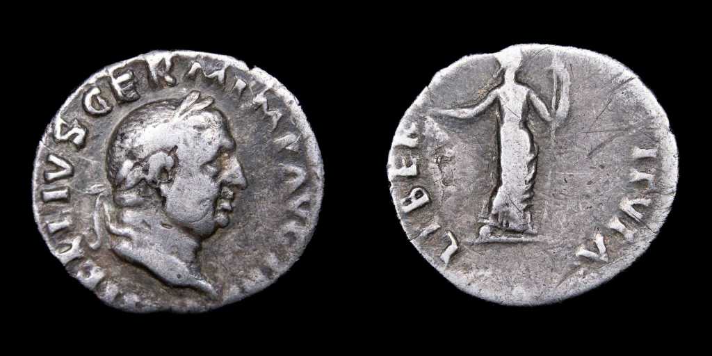 Comenzamos con una pieza de la época de la Guerra Civil tras la muerte de Nerón, más precisamente un Denario de Vitelio, acñado en el tumultuoso «año de los cuatro emperadores» (69 d.C.): Vitelio, quien había sido nombrado por el flamante emperador Galba como gobernador de Germania, fue procamado emperador y marcho sobre Roma. tras vencer al nuevo emperador Otón reinó sólo ocho meses. Fue derrotado por Vespasiano, quien inauguraría a partir de allí la dinastía Flavia.