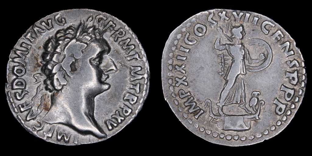 Precisametnte de los flavios, traemos un Denario del hijo de Vespasiano, Domiciano. Con un reverso tipo fechado, podemos saber que fue acuñado bien a finales de su reinado, en el 95/96 d.C.
