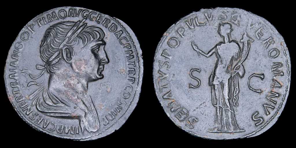 Pasamos luego a un soberbio Sestercio del emperador Trajano, acuñado en sus últimos años de reinado y en el apogeo de expansión imperial, que incluia a la flamante provincia de Dacia, incorporada por este emperador como consta en la titulatura de anverso de esta pieza: DAC (Dacico = Al Dácico).