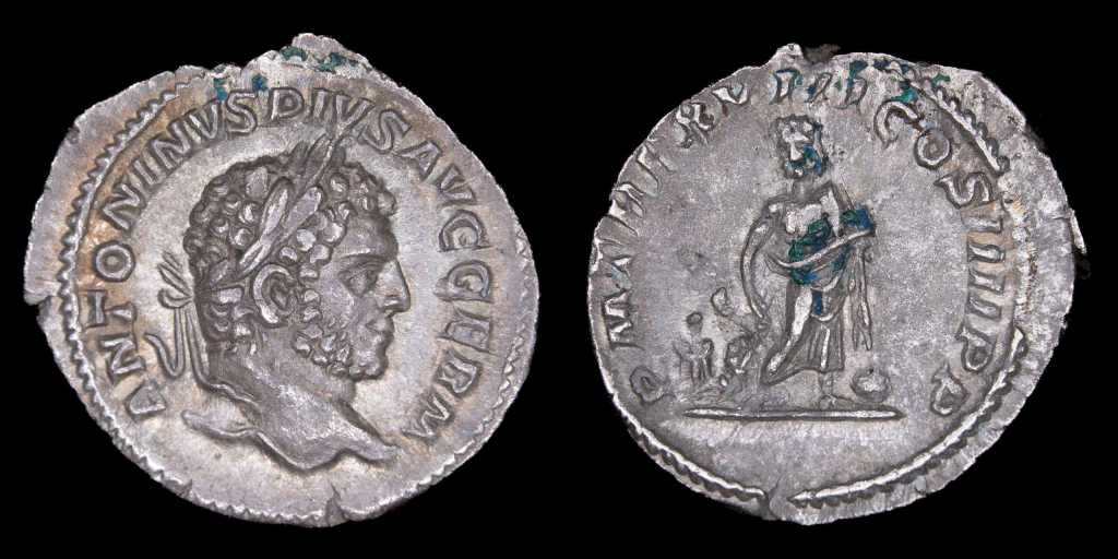 Tendremos también un Denario del cruel emperador Caracalla, representante de la dinastía de los Severos, quien asesino a su hermano y co-emperador Geta. Este Denario también es del tipo fechado, lo que permite ubicarlo en el 215 d.C., bien tardío en su reinado.