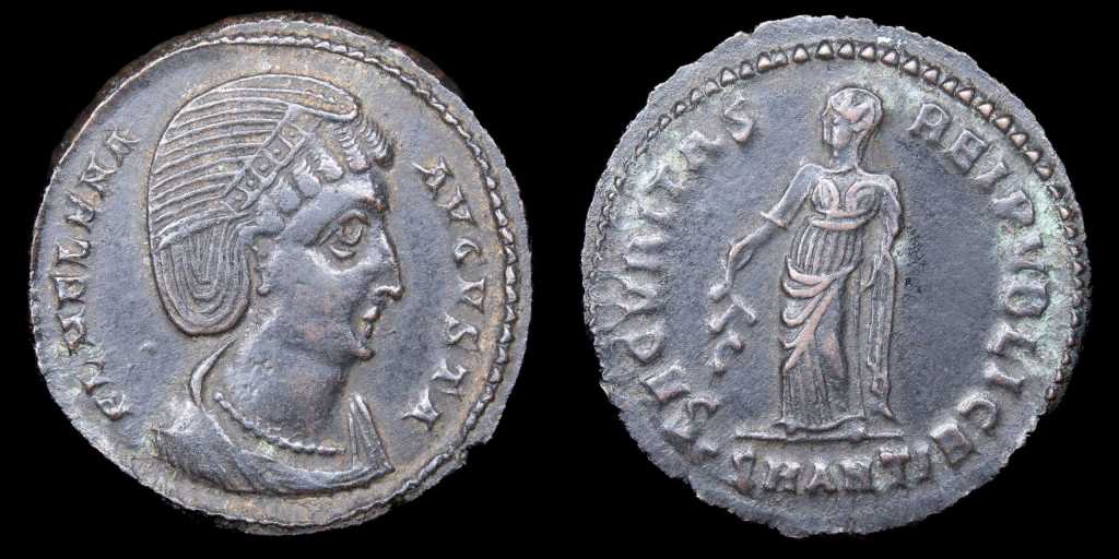 Del período bajo imperial tenemos un Centenional de vellón bajo de Helena, la madre de Constantino I, acuñado en la importantísima ceca oriental de Antioquía, una de las ciudades más populosas del Imperio.