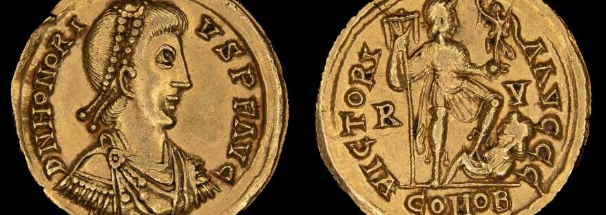Por último tendremos un Sólido de oro, la mayor denominación del período (sin contar piezas especiales) acuñada hacia 402/406 d.C. en la ceca comitatense de Rávena, ciudad que desplazó por sus ventajas defensivas a Mediolanum como capital administrativa occidental tras la invasión de Italia por parte de Alarico y sus visigodos. Estas monedas se acuñaban en oro de la mayor pureza que pudiera conseguirse con los métodos de la época, como lo indica en sus marcas de reverso: COMOB (Comitatus obryzum = Oro puro de la ceca comitatense). Veamos a continuación las piezas mencionadas: