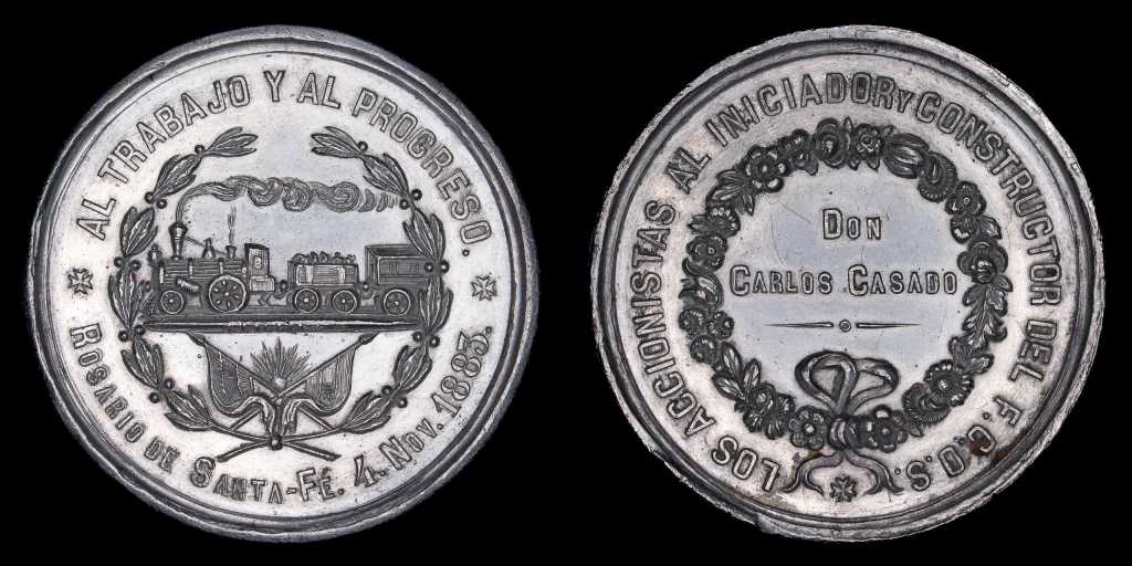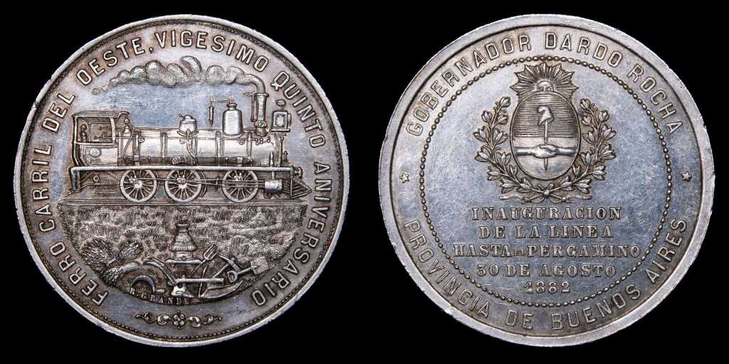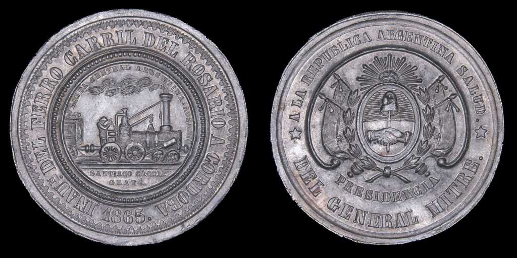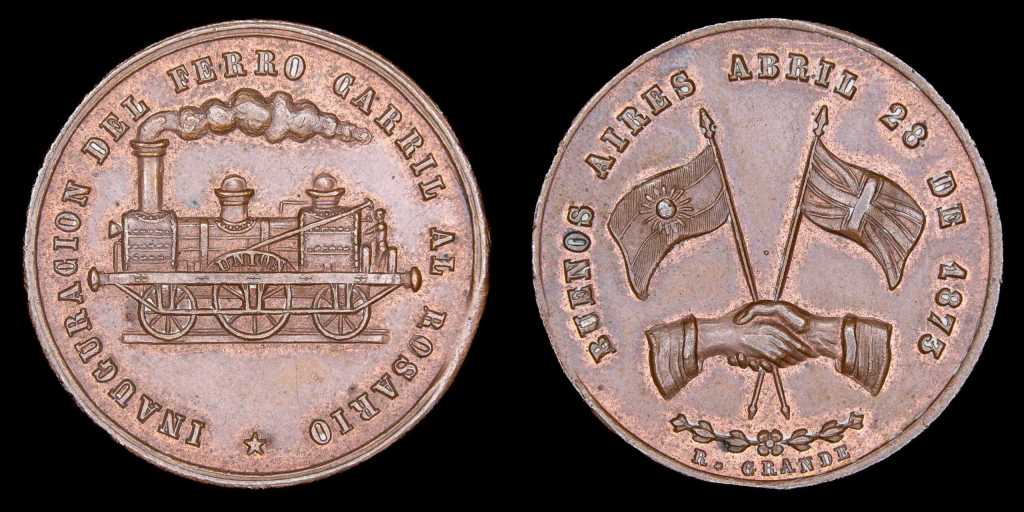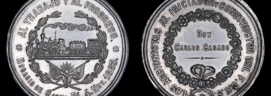Comenzamos con una medalla de Santiago Caccia, grabador italiano radicado en Rosario, quien produjo esta pieza para celebrar el tramo inaugurado bajo la presidencia de Mitre.