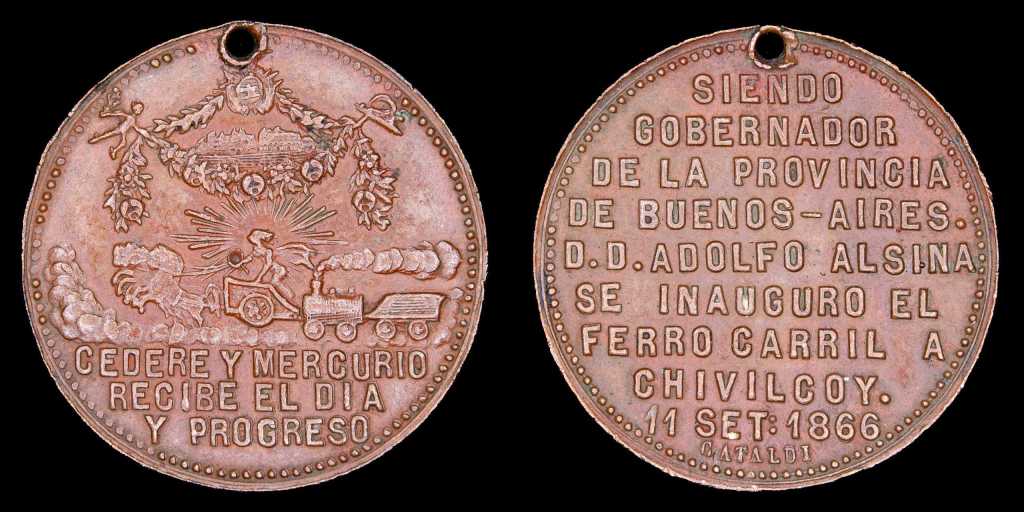 A continuación vemos una pieza que conmemora la inauguración del ramal del Ferrocarril del Oeste a Chivilcoy bajo la gobernación de Adolfo Alsina en Buenos Aires. Esta extensión conectó una zona agrícola clave con el puerto de la capital, facilitando la exportación de cereales: