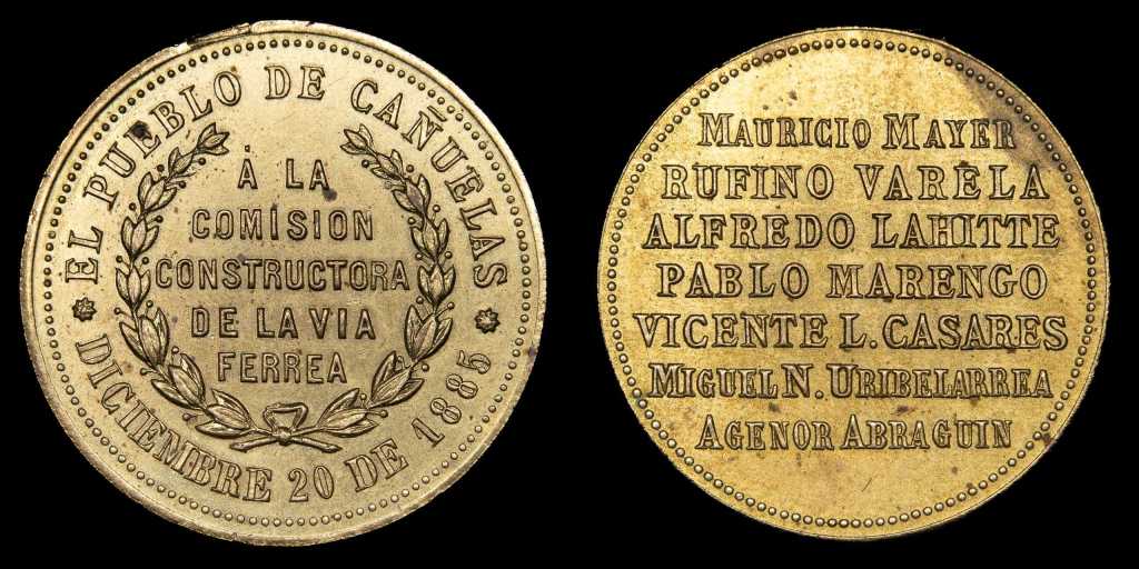 Lote 736. Argentina. Ferroviarias. 1885. Buenos Aires. A la Comisión Constructora de la Vía Férrea. El Pueblo de Cañuelas. Cobre dorado; 33.0mm; 12.76g (XF)