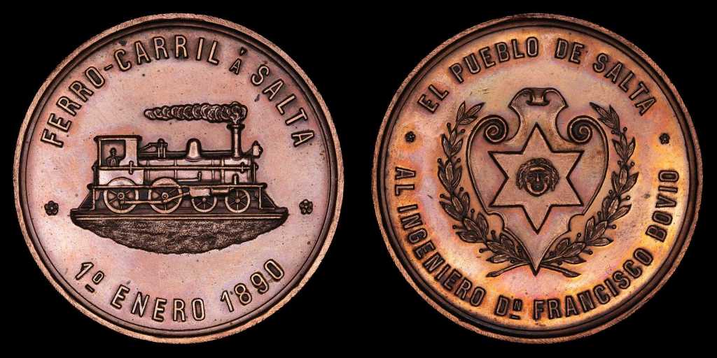 Siguiendo con los homenajes traemos esta medalla dedicada al ingeniero Francisco Bovio por su labor en la construcción de ramales ferroviarios salteños en 1890, vinculando el noroeste del país: