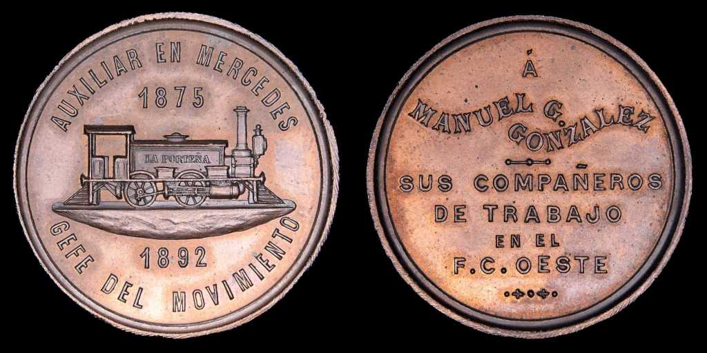 En 1892 Manuel Gonzales también fue homenajeado por sus compañeros de trabajo del Ferrocarril Oeste, en esta medalla de Mercedes: