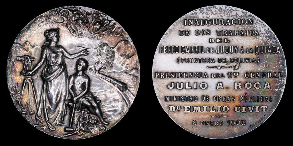 Presentamos también una medalla conmemora la llegada del ferrocarril a La Quiaca, punto fronterizo con Bolivia que completó la integración del Noroeste argentino: