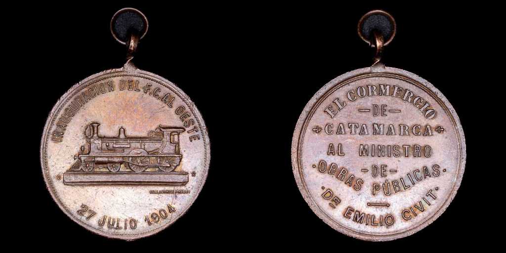 Luego conmemorando la inauguración del Ferrocarril al Oeste en Catamarca, tenemos esta medalla. El sector comercial local homenajeó al Ministro Emilio Civit, impulsor de obras públicas en el Noroeste: