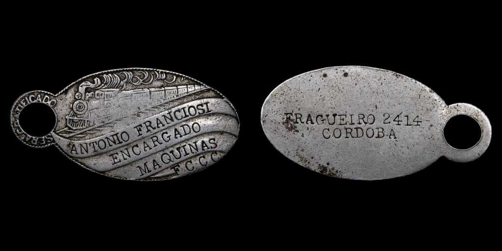 Lote 760. Argentina. Ferroviarias. FFCC Ferrocarril Central Córdoba ND1910-1938. Encargado de Maquinas, otorgada a Antonio Franciosi. Reverso FREGUEIRO 2414 CORDOBA punzonado. Plata?; 42x21mm; 4.82g. (VF) Rara